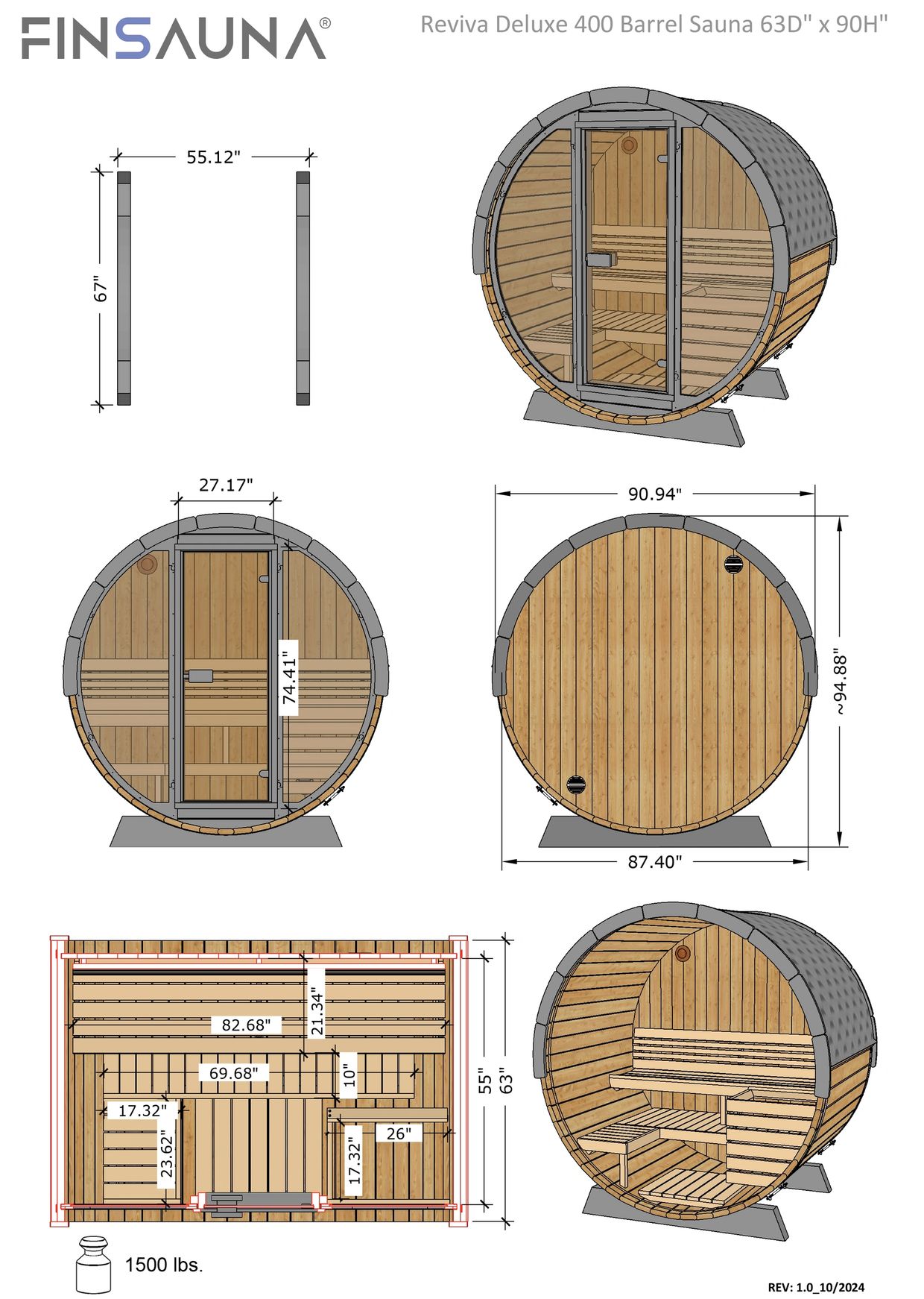 The Reviva Deluxe 400 sauna barrel has a large 7’3” interior diameter and comfortably accommodates up to 4 bathers. The smooth, contoured Thermo-Aspen benches and backrests (1.1” thick) are ergonomically crafted to provide optimal bather support. Its elevated seating and lower footrest provide the ultimate in convenience and relaxation.